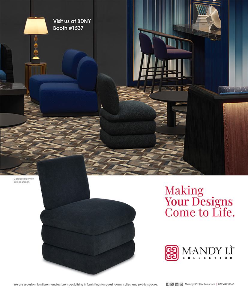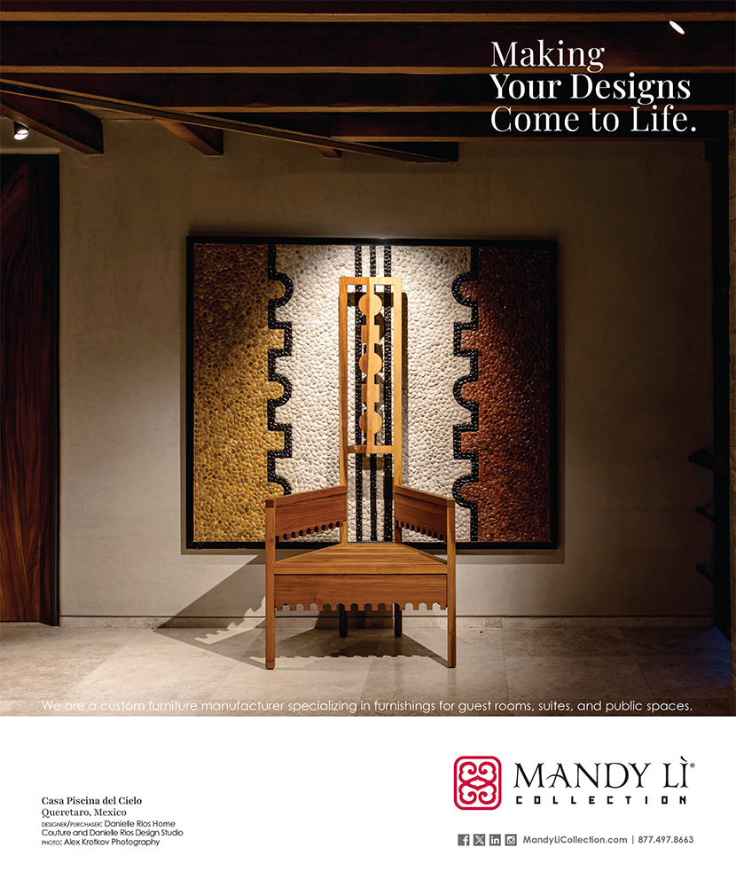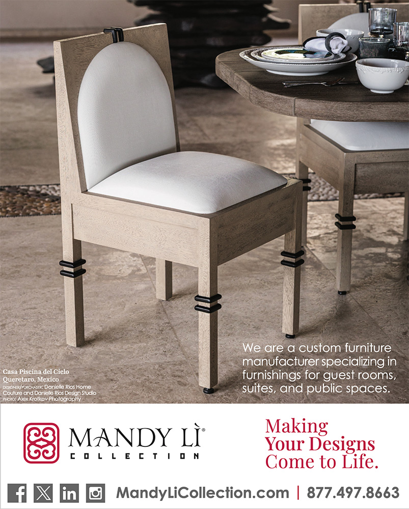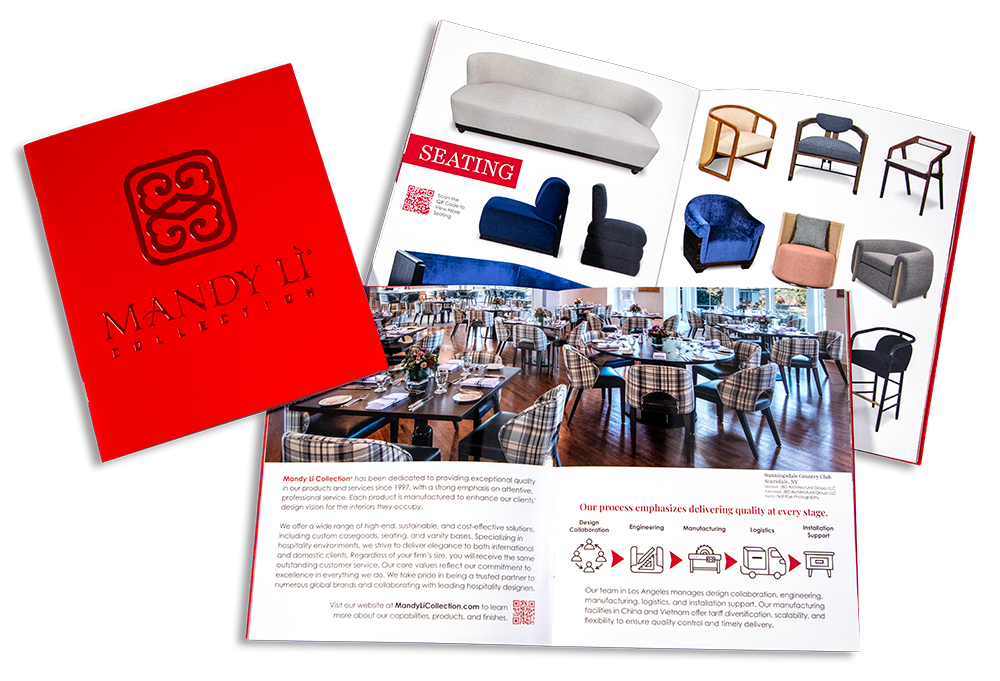 The Mandy Li Collection website showcases the company’s international services, manufactured products, finishes, project showcase, media, and sales reps.
