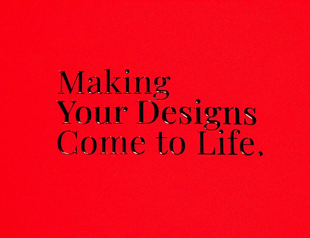 Each cover is made of high-end red soft-touch paper with embossment, spot gloss, and die-cutting. An opaque paper insert with spot-color printing is also included. Interior pages have a spot-gloss finish.